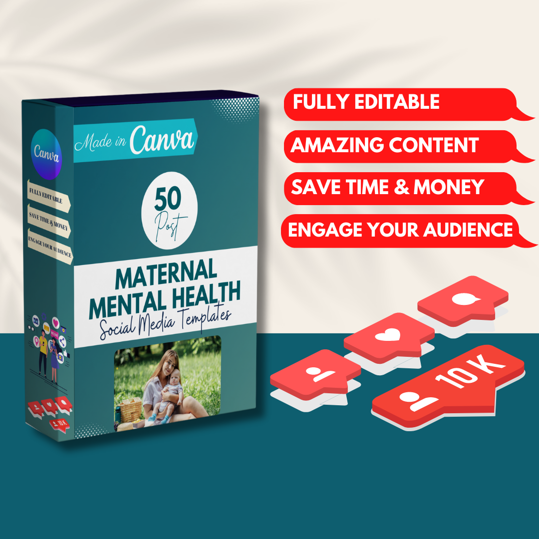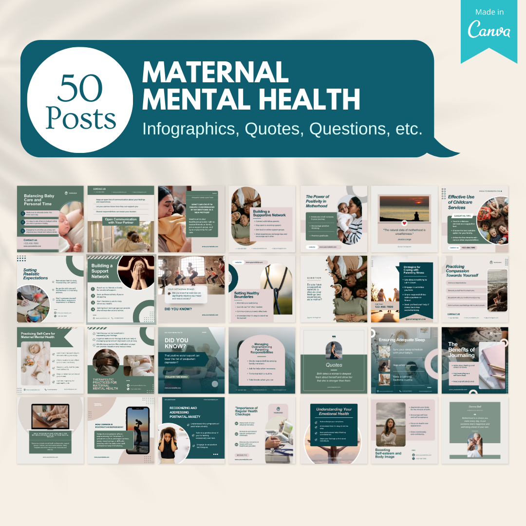 This exclusive bundle includes 50 carefully crafted Canva templates, designed to help you share valuable information and insights about maternal mental health. Engage your audience with detailed infographics, relevant quotes, thought-provoking questions, and "did you know" facts about motherhood and mental health. 🎨🤱🔍