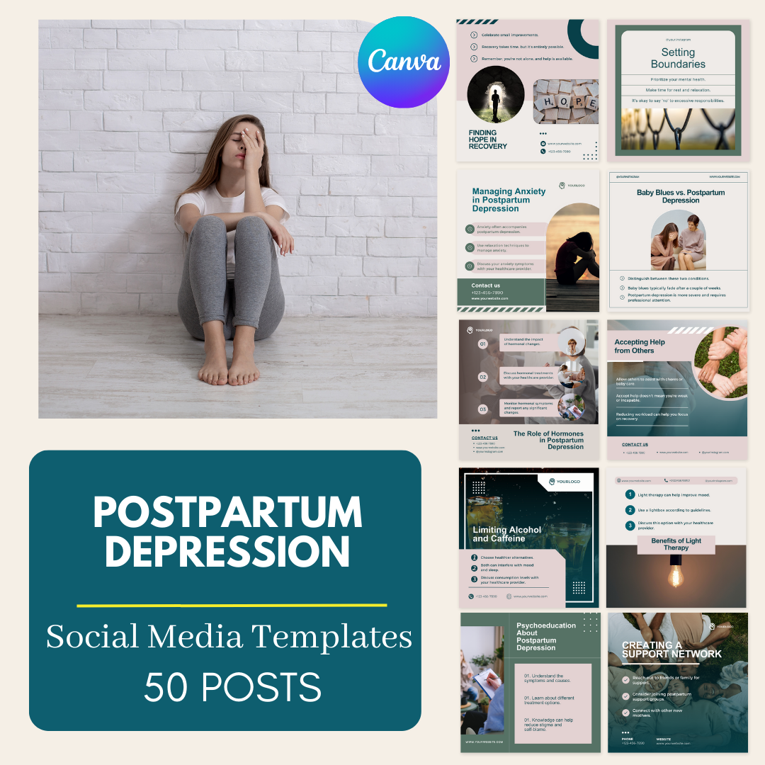 Introducing the "Postpartum Depression" Social Media Canva Templates Bundle, designed for mental health advocates, therapists, counselors, and all professionals in the postpartum care field! 🤱✨💻