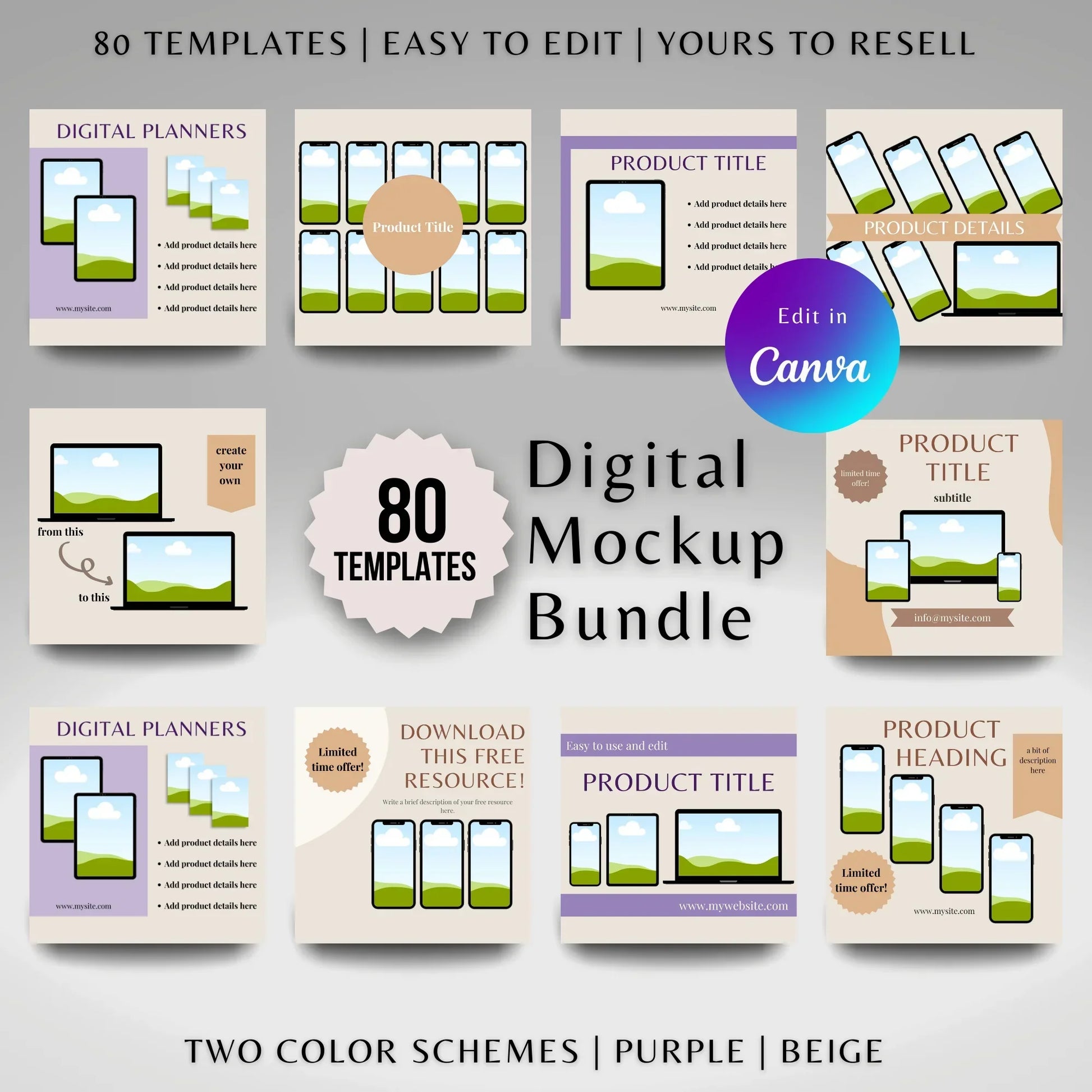 These mockups come in matching pairs of Beige and Purple, allowing for a cohesive and visually appealing presentation across your digital platforms.