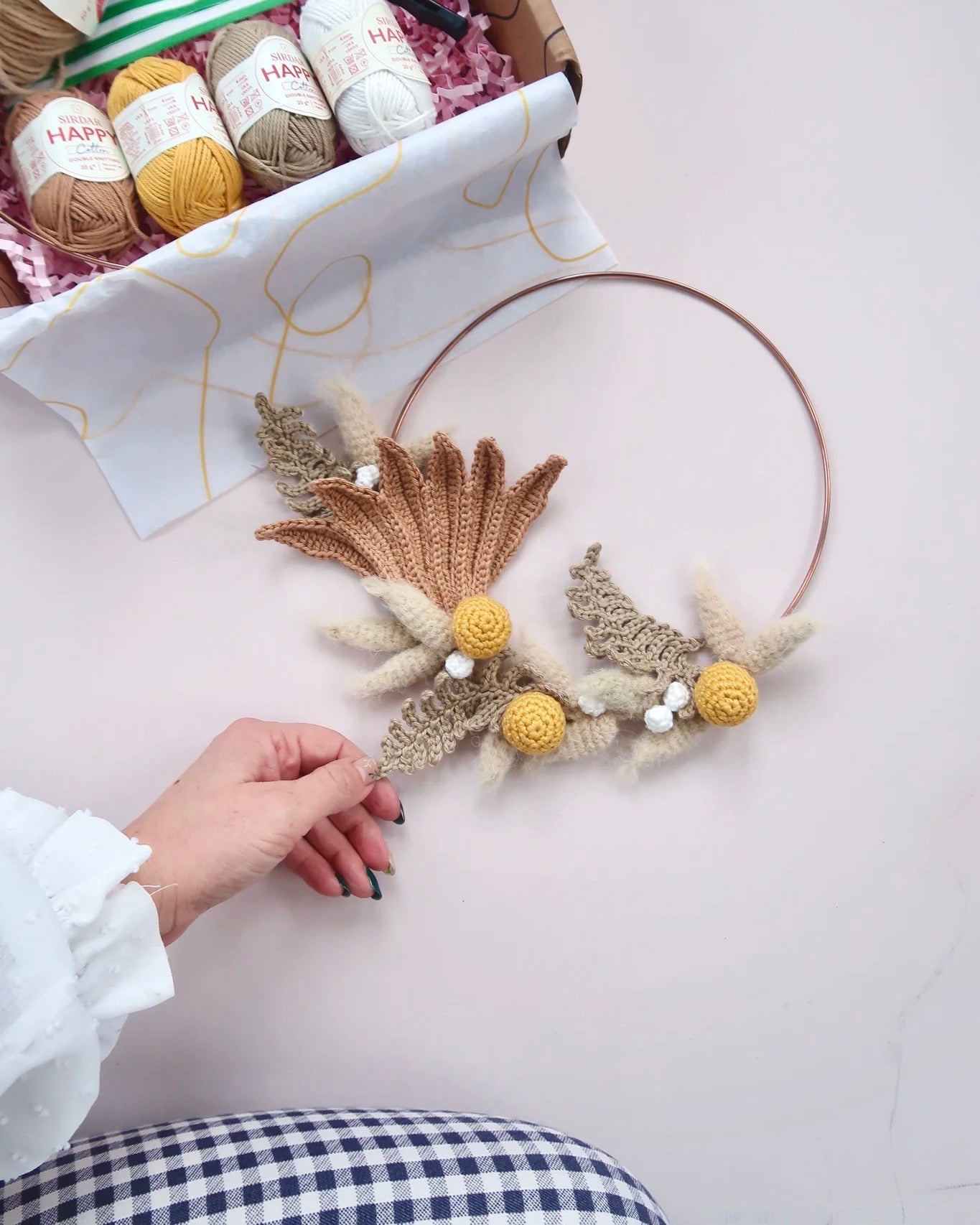 Using a combination of techniques, including crochet in the round, slip stitches and double crochet, we'll work through each of the individual elements using the pattern and the video, and then bring them together to make a beautiful timeless hoop.